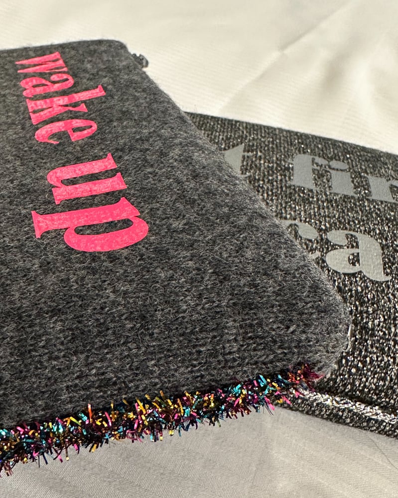 Variante scuba lana grigio con bordino metalizzato e stampa "wake up & make up" rosa fluo.